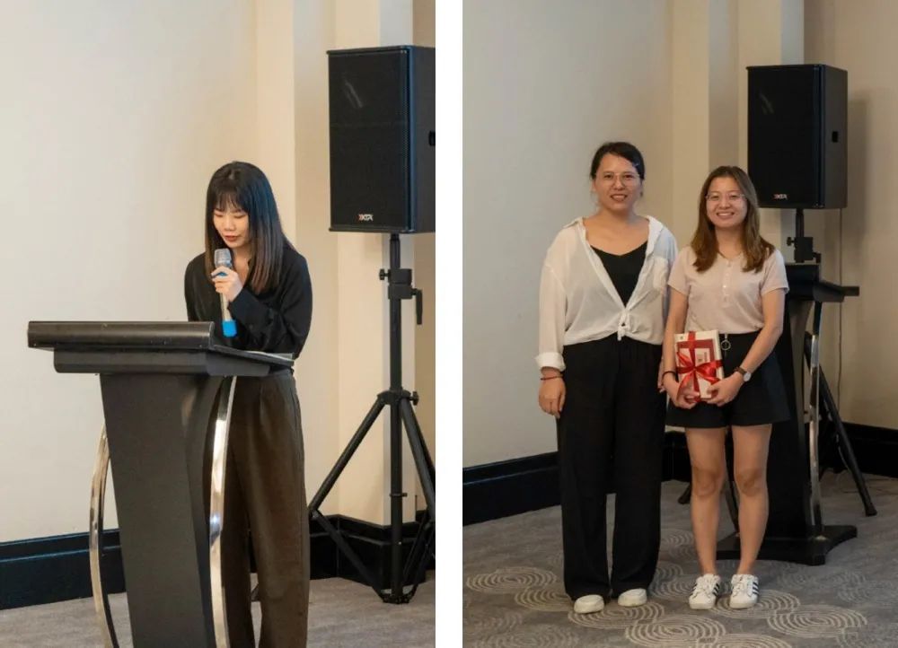 解洲水作为师父代表讲述了工作中自己成长经历的感受,表达了她对徒弟宋佳敏的期望,同时对公司举办的师徒结对活动给予了肯定和支持,号召同事们不光向自己的师父学习,身边的同事也都可以成为学习的榜样。徐婉婷作为徒弟代表通过精彩的演讲表达了对公司、领导及师父的诚挚感激,以及未来更上一层楼的奋斗决心。