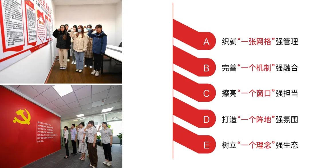在工作执行上,积极发挥党员模范带头作用,认真学习政府机关、国有企业的相关政策,深入践行社会主义核心价值观;在组织模式上,公司以党支部为平台,柔性管理为手段,筹划建立工会、妇联,构建发展新格局;在企业文化上,充分利用主题党日开展各类特色活动,强化企业文化宣传,同时注重在日常工作中选树典型,凝聚全员思想共识,构建党建引领文化建设的联动机制。