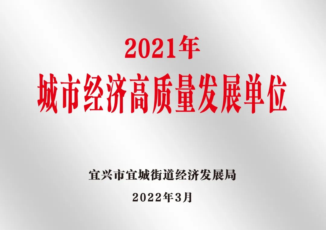2021年,宜兴市委、市政府出台关于促进经济社会高质量发展的相关文件精神,创新实干建新城,勇做宜兴市“两争一前列”领跑者,宜城街道出台“宜城街道城市经济高质量发展十条政策意见”,助推城市经济发展,助推强富美高新宜城建设!此次公司能够获得“2021年度城市经济高质量发展单位”荣誉,体现了政府部门对公司助力宜兴经济高质量发展能力的肯定和认可。