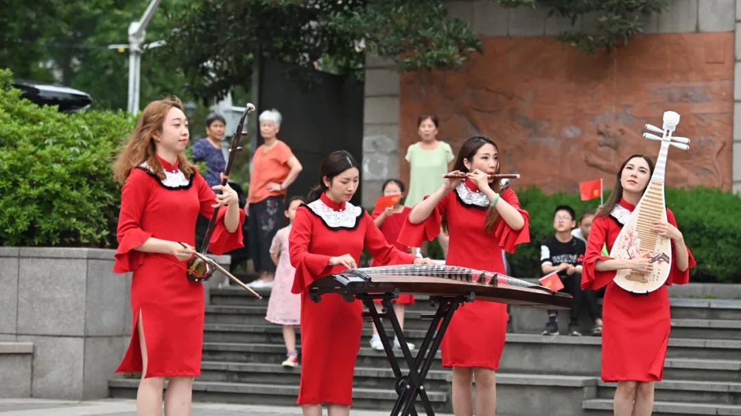 6月25日下午5点半,在江苏宜兴的宜城街道和平社区周王庙广场,一场别有风味的“唱支山歌给党听”主题快闪正式拉开序幕。