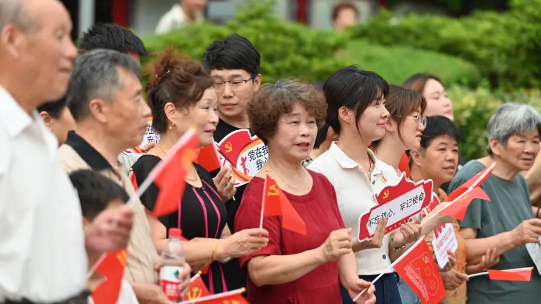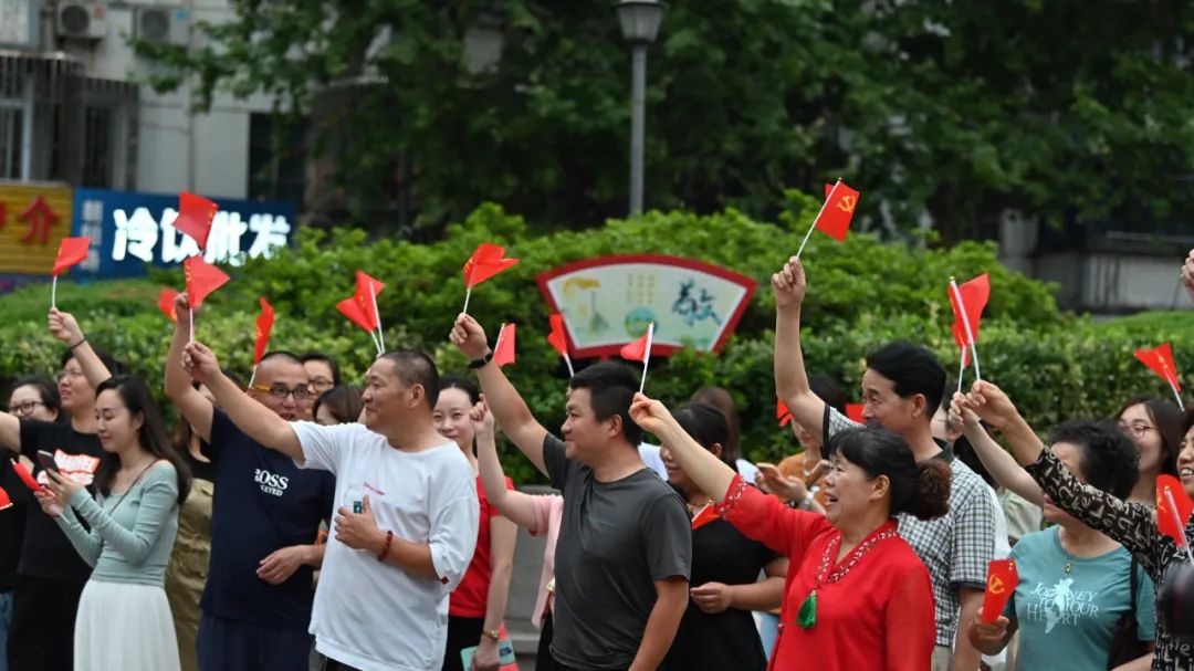 快闪现场聚集了众多社区群众,鲜红的党旗映衬着张张笑脸,筑起了一道靓丽的风景线。