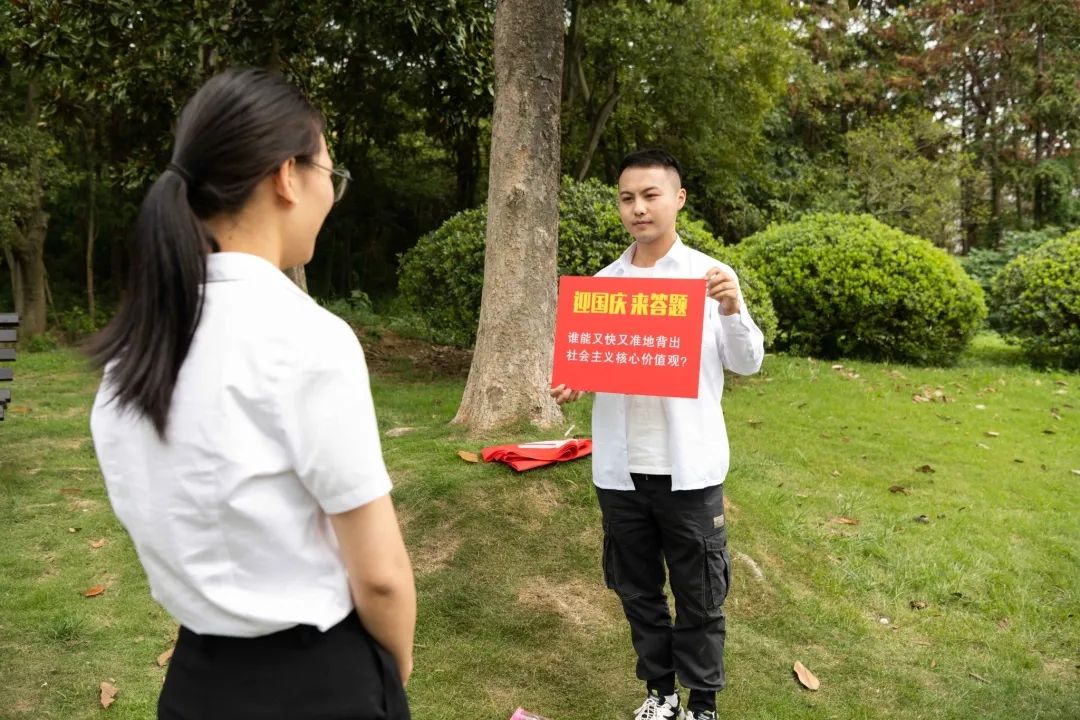 徒步结束后,公司青年团员们沐浴在清新的森林气息中,开展了热烈而有趣的“迎国庆”红色知识竞答活动。本次活动将现场参赛团员分为两组,各组选手举手抢答,并采取答对加6分、错答扣2分的评分机制。