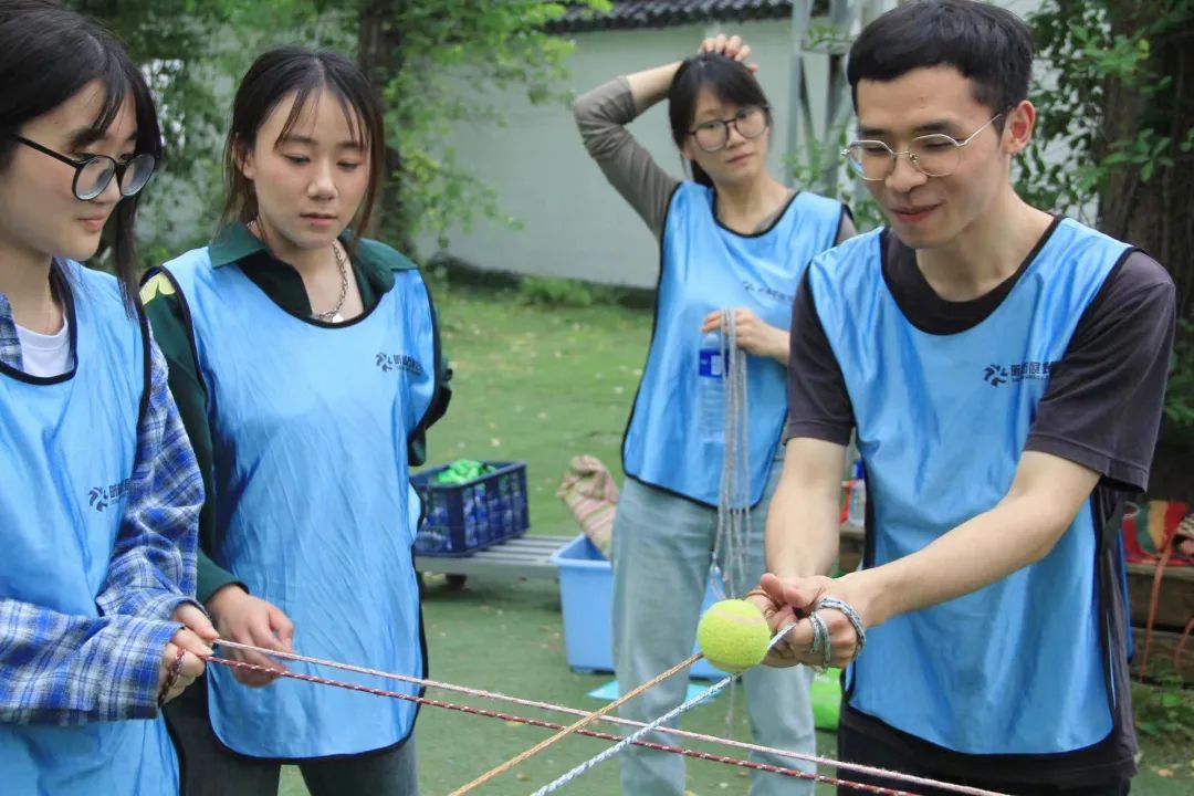 “慢一点,再慢一点,稳住!”“纵横天下”游戏中,大家两人一组,双手拉住两条绳索的一端,连成一条轨道,一颗网球在绳轨上颤颤巍巍地来回滚动。两名队员屏住呼吸,小心翼翼地拉紧绳索,将网球运到球桶正上方,慢慢拉开绳索,让网球从两绳之间落进桶里。